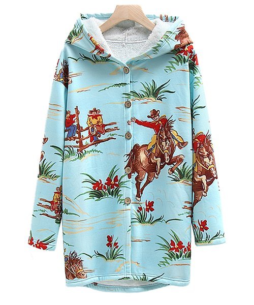Blue Floral Cowboy Fuzzy Hooded Button-Up Coat
