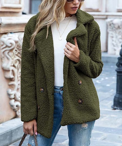 Army Green Notch-Collar Double-Breasted Teddy Jacket